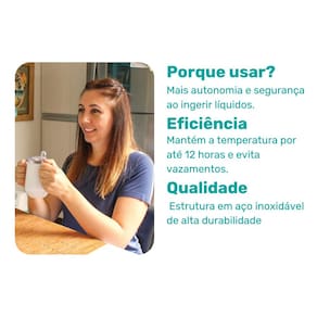 A Caneca Térmica Adaptada foi desenvolvida para oferecer mais autonomia e conforto no momento de ingerir líquidos, especialmente para pessoas com mobilidade reduzida nas mãos ou condições específicas de saúde.