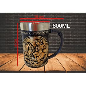 Caneca Viking São Jorge De Chopp Cerveja Inox/ Resina 600ml Apresentamos a Caneca 3D São Jorge Resinada com Detalhes impressionantes - uma verdadeira obra de arte funcional que combina estilo, tradição e qualidade premium. Esta caneca excepcional é muito mais do que um simples recipiente para bebidas; é uma representação impressionante do lendário São Jorge e uma peça de destaque para qualquer coleção. O design em 3D da caneca retrata São Jorge em toda a sua glória, capturando detalhes minuciosos que evocam a bravura e a força do lendário cavaleiro. A resina de alta qualidade utilizada na confecção realça cada traço e expressão, dando vida à figura icônica. Além disso, os detalhes em inox estrategicamente incorporados acrescentam um toque moderno e sofisticado, criando um contraste marcante entre o tradicional e o contemporâneo. A funcionalidade desta caneca é tão excepcional quanto sua estética. Com capacidade generosa, é perfeita para desfrutar de uma ampla variedade de bebidas, desde café e chá até chocolate quente e muito mais. O acabamento em inox na borda da caneca proporciona um toque luxuoso aos lábios enquanto se bebe. Seja para uso pessoal, como um presente especial ou como peça de decoração, a Caneca 3D São Jorge Resinada com Detalhes em Inox é uma escolha notável. Celebre a história, a coragem e a beleza artística com este elegante objeto que une tradição e contemporaneidade de maneira única e cativante. Material: Resina e Inox Dimensões: 15cm x 11.00cm x 14.50cm Peso: 429.00g Características: - Alta qualidade - Design criativo - 600ML Marca: Emporio Canto Do Churrasco Ean: 7908045140268