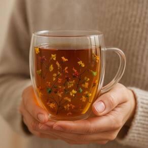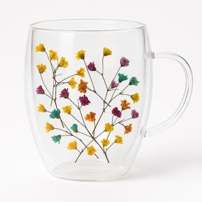Caneca de vidro dupla parede com pétalas de flores - beleza e funcionalidade para sua bebida A caneca de vidro dupla parede com pétalas de flores é uma peça que une elegância e praticidade, transformando o momento de saborear sua bebida favorita em uma experiência visual encantadora. Com capacidade para 350ml, esta caneca é ideal para chás, cafés, cappuccinos e outras bebidas quentes ou frias.