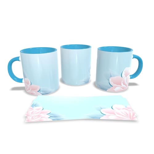 Caneca personalizada de porcelana de alto brilho, com interior e alça Azul com linda Estampa da Coleção Flores.