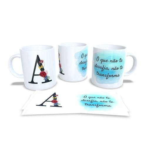 Caneca personalizada de porcelana de alto brilho, com interior e alça branca com linda Estampa Alfabeto Floral Black.