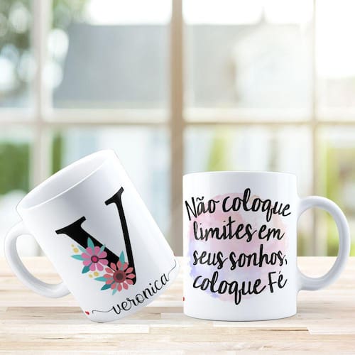 Caneca personalizada de porcelana de alto brilho, com interior e alça branca com linda Estampa Alfabeto Floral Frases.