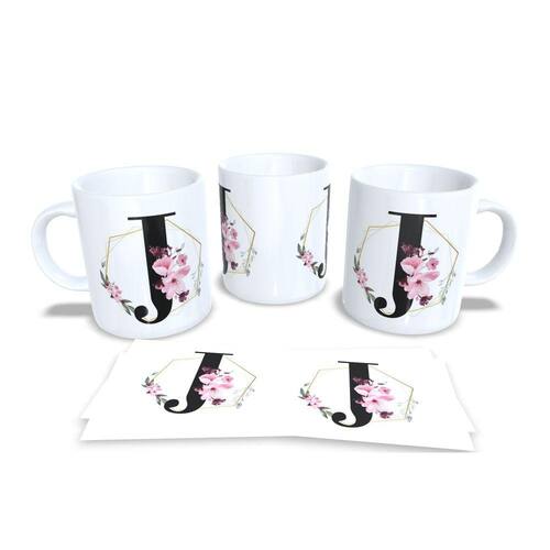 Caneca personalizada de porcelana de alto brilho, com interior e alça branca com linda Estampa Alfabeto Floral Gramur.