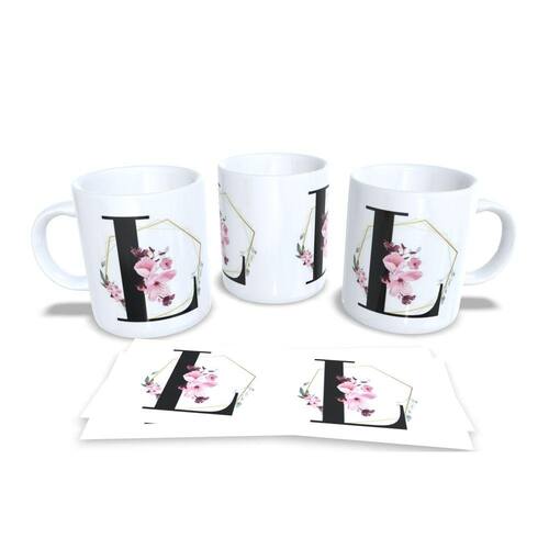 Caneca personalizada de porcelana de alto brilho, com interior e alça branca com linda Estampa Alfabeto Floral Gramur.