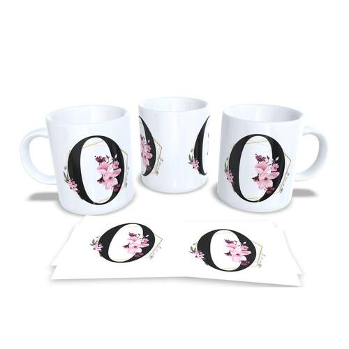 Caneca personalizada de porcelana de alto brilho, com interior e alça branca com linda Estampa Alfabeto Floral Gramur.