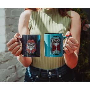 - O amor pode ser assustador: experimente os assustadores com estas xícaras de café com um mashup festivo de feriado. O par inseparável Jack e Sally aparecem como caveiras de açúcar nestas canecas roxas e azul-petróleo, respectivamente.