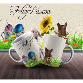 Caneca personalizada de porcelana de alto brilho, com alça e interior branca Coleção Páscoa.