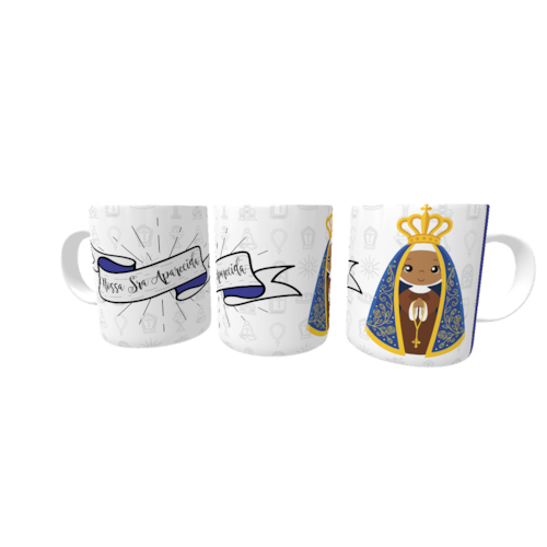 Caneca de porcelana de alto brilho, com alça e interior branca Coleção Santos da Igreja Catolica.