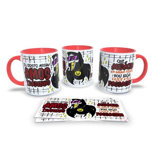 Caneca personalizada de porcelana de alto brilho, com interior e alça Vermelha com a Estampa Amostradinho.