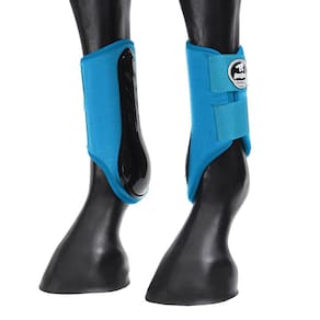 Par de Combination Boots Rodeo West, fabricados em neoprene com fechamento em tira autocolante e reforço em vinil, é composto de boleteira em conjunto com o cloche formando apenas uma peça dando maior proteção para o animal. Utilizados nas patas dianteiras do animal.