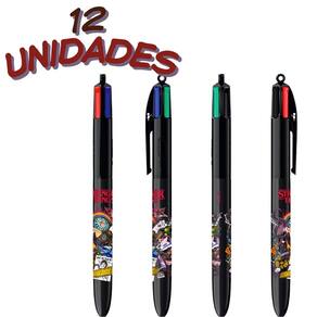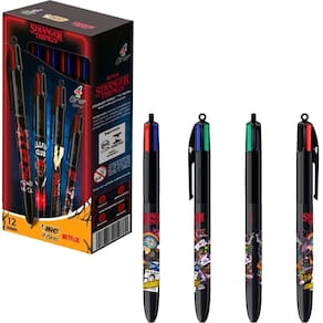 Descrição do produto : A Caneta BIC 4 Cores e um icone de mercado! Nesse modelo classico que conta com tintas classicas, com apenas um clique no botao, voce seleciona a cor que deseja. Cada Caneta ainda possui corpo decorado com tematicas de Stranger Things, dando um ar enigmatico e cheio de personalidade para essa caneta tao iconica da BIC. As Canetas contam com ponta media de 1.0mm com largura da linha de 0.32mm. Alem disso, nao travam durante o uso! Conjunto de Canetas com 12 Unidades. :