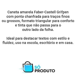 Descrição A caneta amarela faber castell grif pen é a escolha perfeita para destacar seus textos com estilo e fluidez. Com sua ponta chanfrada, você pode criar traços finos ou grossos de acordo com sua necessidade. Seu formato triangular garante maior conforto ao escrever e sua tinta não passa para o outro lado da folha. Ideal para uso na escola, no escritório e em casa.
