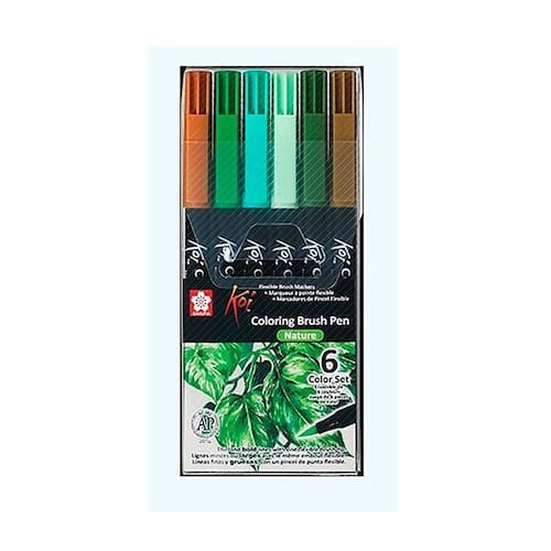 Caneta Brush Artistica Sakura Koi Coloring Nature 6 Cores Obtenha pinceladas finas, médias ou grossas mudando a pressão sobre a ponta. A ponta durável retorna rapidamente para a forma , traço após traço. - Indicado para artistias gráficos, designers, ilustradores, arquitetos e cartunistas - Fácil de combinar - Tinta a base de água - Contém 6 cores: 110 Dark Brown, 226 Emerald Green, 28 Blue Green Light, 128 Ice Green, 130 Sap Green, 47 Raw Umber