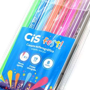 - Ponta agulha 0,7mm: traços finos e precisos para escrita clara e organizada. - Escrita suave: fluxo de tinta constante que garante conforto até em usos prolongados. - Corpo alongado de 19cm: design moderno com listras brancas e cor correspondente à tinta. - Praticidade no dia a dia: tampa protetora que evita ressecamento e mantém a durabilidade. - Kit completo com 8 canetas esferográficas coloridas. - Qualidade CiS: marca reconhecida pela inovação e variedade em materiais de escrita e papelaria.