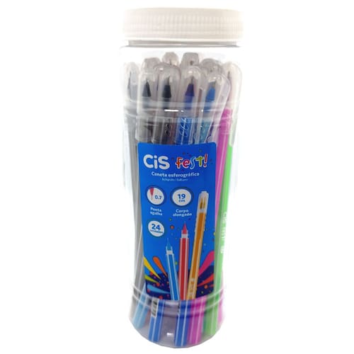 - Ponta agulha 0,7mm: traços finos e precisos para escrita clara e organizada. - Escrita suave: fluxo de tinta constante que garante conforto até em usos prolongados. - Corpo alongado de 19cm: design moderno com listras brancas e cor correspondente à tinta. - Praticidade no dia a dia: tampa protetora que evita ressecamento e mantém a durabilidade. - Kit completo: pote com 24 canetas esferográficas coloridas em cores diversas (com repetições). - Qualidade CiS: marca reconhecida pela inovação e variedade em materiais de escrita e papelaria.