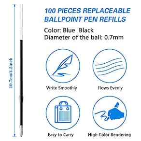 Informações básicas: Nome: recargas de caneta de tinta Tamanho: 10,7 cm/4,2 polegadas Material: plástico, cor da tinta: preta Embalagem: 100 x Recargas de caneta esferográfica Características: 1. Secagem rápida, fácil de usar, sem derramar ou desbotar. Ponta de 2,0,7 mm para uma escrita suave e uma experiência de escrita estável. 3. Leve e fácil de manusear. 4. É adequada para escritório, empresa, escola e família. 5. Caneta esferográfica refis Uma pí com boa textura pode ser compartilhada com colegas de classe ou colegas. Comprimento adequado: cada refil de caneta tem cerca de 10,7 cm/4,2 polegadas de comprimento, você pode cortar seu comprimento para combinar com várias canetas, não apenas adequado para canetas retráteis. Dicas: Remova a tampa esférica da ponta da caneta antes de escrever.