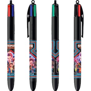 Descrição do produto : A Caneta BIC 4 Cores e um icone de mercado! Nesse modelo classico que conta com tintas classicas, com apenas um clique no botao, voce seleciona a cor que deseja. Cada Caneta ainda possui corpo decorado com os marcos das 4 primeiras temporadas de Stranger Things, dando um ar enigmatico e cheio de personalidade para essa caneta tao iconica da BIC. As Canetas contam com ponta media de 1.0mm com largura da linha de 0.32mm. Alem disso, nao travam durante o uso! Conjunto de Canetas com 4 Unidades. :