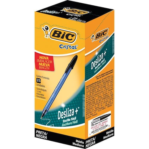 Caneta Esferográfica Cristal Soft Preta Caneta esferográfica Cristal Soft.Com uma linha de materiais da Bic, você garante toda a qualidade necessária para realizar suas tarefas e trabalhos impecáveis. Caneta esferográfica Cristal Desliza + possui ponta 1.2mm, tampa e plug da mesma cor da tinta. Sua tinta é exclusiva fórmula BIC e de tungstênico, garantem ótimo rendimento. Acompanha uma caixa com 25 canetas Bic Cristal Soft. Cor: Preto.