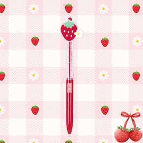 Certificada pelo Inmetro, a caneta também possui um delicioso aroma de fruta no morango decorativo, garantindo uma experiência sensorial de escrita confortável e aromática.