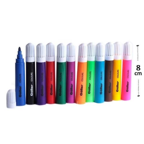 Caneta Hidrográfica 12 Cores Mini Big Caneta Hidrográfica 12 Peças Mini Big Colors - Caneta Hidrográfica 12 Cores Mini BIG tem formato redondo, cores intensas, corpo na cor da tinta e tampa antiasfixiante;\n- Tamanho mini com corpo espesso para as crianças levar no estojo escolar;\n- Recomendado para crianças maiores de 3 anos de idade;\nEspecificações:\nMarca : DAIWA\nTipo de material : Resinas termoplásticas, base de água, corantes e umectantes, pavio de acetato e fibra de poliéster\nCores ou Estampa : Colorido\nDimensões do Produto : 8cm X 1,5cm X 1,5cm CM\nDimensões da Embalagem : 12,5 X 21 X 1,5 CM\nPeso Bruto (Gramas) : 0.077