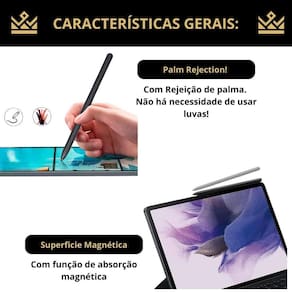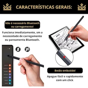 Caneta touch com alta precisão e sensibilidade para desenho, escrita e navegação. Ajuda a manter a tela limpa, evitando marcas de dedos. Não requer emparelhamento Bluetooth, pronta para uso imediato. Inclui kit com 3 pontas extras.