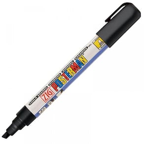 O modelo ZIG Posterman PMA-50 possui uma ponta chanfrada, o que proporciona traços de até 6mm conforme ângulo aplicado, com cores fortes e alta cobertura seu pigmento concentrado cria aparência opaca aveludada. A tinta também é à prova d'água e resistente à luz, o que significa que não desbota com o tempo.