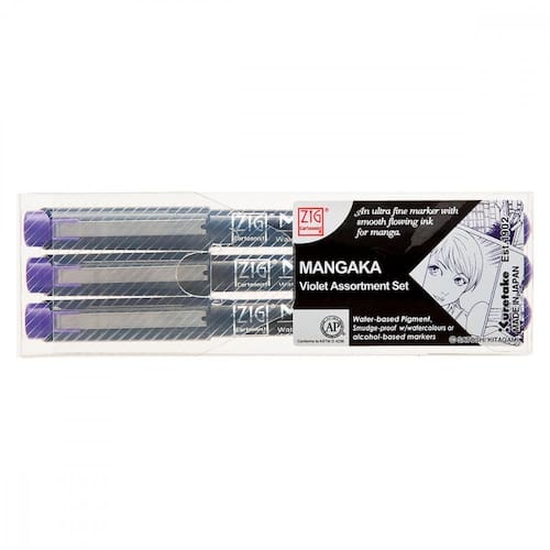 Estojo com 3 canetas Mangaka de tinta violeta nos tamanhos 0.1 / 0.3 / 0.5mm. Produzida no Japão, a caneta Nanquim Nangaka Kuretake foi projetada para , artista gráfico, desenhistas, designers e artistas em geral. Permite criar infinitos estilos de arte. Depois de seca a tinta não sangra. é a prova de manchas com aquarelas, de tintas base água ou à marcadores à base de álcool. Pigmento à base de água, resistente à luz, sem xileno, inodoro. Marca: Não Informado Ean: 4901427223590