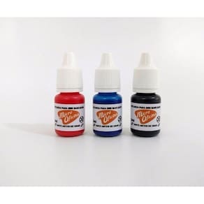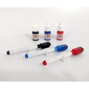 Kit composto por: - 3 mini canetas para quadro branco nas cores azul, preto e vermelho; - 3 suportes com fita dupla face. Basta destacar e colar o suporte onde desejar; - 3 recargas de tinta.
