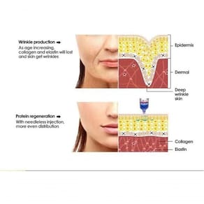 Com a ajuda da energia de ação mecânica, a mola e o pistão especial no aparelho permitem, sob pressão, empurrar rápida mas suavemente o fluxo do através de um orifício microscópico para o tecido subcutâneo.