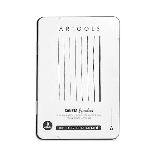 -estojo metálico com 8 canetas -graduações das pontas: 0.05, 0.1, 0.2, 0.3, 0.5, 0.8, 1.0 e chanfrada -traço intenso de alta pigmentação -tinta resistente à ação da luz e da água -medidas do estojo: 18,5x12,5x1,5 cm -peso do estojo: 0,186 kg -referência: 689142 Ean: 7897476689142