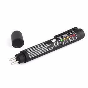 Caneta testadora de fluído de freio Este dispositivo inovador mede o nível de umidade do fluido de freio, detectando a presença de umidade. O resultado é exibido de forma clara através de indicadores luminosos. A presença excessiva de água no fluído, impacta diretamente na eficiência da frenagem. O sistema de luzes auxilia na identificação da condição do fluído. O funcionamento é simples e intuitivo, baseado na alteração da condutividade do fluído. Os leds indicadores na própria caneta mostram claramente a necessidade de troca: - verde: em boas condições. - amarelo: aceitável, mas requer em breve. - vermelho: troca imediata necessária. Modo de uso Pressione o botão para ligar o dispositivo. - se a luz verde acender, a bateria está adequada. - se não houver iluminação, a bateria precisa ser substituída. - o equipamento desliga automaticamente se não houver operação. Especificações técnicas Compatível com fluídos dot 3, 4 e 5. - verde: fluído sem presença de água. - verde/amarelo: teor de umidade abaixo de 1%, garantindo ótima performance. - verde/amarelo/amarelo: umidade em torno de 2%, ainda utilizável. - verde/amarelo/amarelo/vermelho: aproximadamente 3% de umidade, necessitando . - verde/amarelo/amarelo/vermelho/vermelho: teor de água acima de 4%, troca imediata recomendada por questões de segurança. fácil de usar alimentação por 01 pilha aaa não acompanha o produto Conteúdo da embalagem: 01 caneta teste de fluido de freio