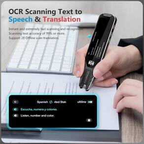 Características: Digitalização de Tradução HD+ Tela Alta Precisão Uso Offline Especificação: Nome: Caneta tradutora AI Material da fuselagem: Plástico Capacidade da bateria: 1200 mAh A interface de carregamento: Tipo C O pacote inclui: 1* Caneta tradutora 1* Cabo USB-C 1* Manual - Caneta de leitura e tradução inteligente: a caneta tradutora inteligente identifica o conteúdo digitalizado em 0,2 segundos após a digitalização e lê em voz alta instantaneamente, a precisão do conteúdo digitalizado chega a 98%. Possui uma tela LCD sensível ao toque integrada de 3,5 polegadas fácil de usar. - Dispositivo tradutor de idiomas bidirecionais: você pode falar livremente mesmo quando estiver offline, esta caneta tradutora tem funcionalidade offline suporta tradução de voz em 9 idiomas e tradução de fotos em 28 idiomas. Também existem mais de 134 idiomas em tradução online em tempo real. - ESCUTA E LEITURA INTELIGENTE: A caneta de leitura inteligente é uma ferramenta perfeita para dislexia. O scanner de caneta transcreve automaticamente a fala em texto e pode ajustar a velocidade de saída de fala. Ao mesmo tempo, a pronúncia de pessoa real ajuda a melhorar a audição e a fala. - DISPOSITIVO DE FUNÇÃO MUTLI: Gravação em sala de aula e escritório a qualquer momento, gravação com decodificação de redução de ruído HD de microfone duplo, a gravação pode durar até 3 horas. Adotando processador de tradução de alto desempenho e redução de ruído inteligente, pode reconhecer e traduzir com precisão em ambientes ruidosos. Mais conveniente para viagens de negócios. - Fácil de usar, design durável: corpo de liga de alumínio, diferente do corpo de plástico de outros produtos, tornando o produto mais durável e confortável de segurar. O botão home de metal facilita a operação.