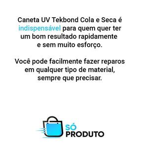 DescriçãoCaneta uv tekbond cola e seca é uma cola indispensável para quem quer ter um bom resultado rapidamente e sem muito esforço faça reparos duradouros em segundos com a caneta uv tekbond cola e seca. Basta aplicar a resina e ativar o local com a luz uv presente na caneta para promover uma solda resistente ou preencher rachaduras. Com a caneta uv tekbond cola e seca, você pode facilmente fazer reparos em qualquer tipo de material, sempre que precisar.DetalhesA cola uv é ideal para materiais difíceis de serem soldados, como plástico, vidro e metal. É uma ótima opção para quem quer fazer reparos rápidos e duráveis.EspecificaçõesMarca tekbondContém 1 unidade de 4gCor transparenteAdesão fácil, forte e rápidoValidade: 12 mesesCaracterísticasBasta aplicar a resina e ativar o local com a luz uv presente na caneta para promover uma solda resistente ou preencher rachaduras.As imagens são meramente ilustrativas