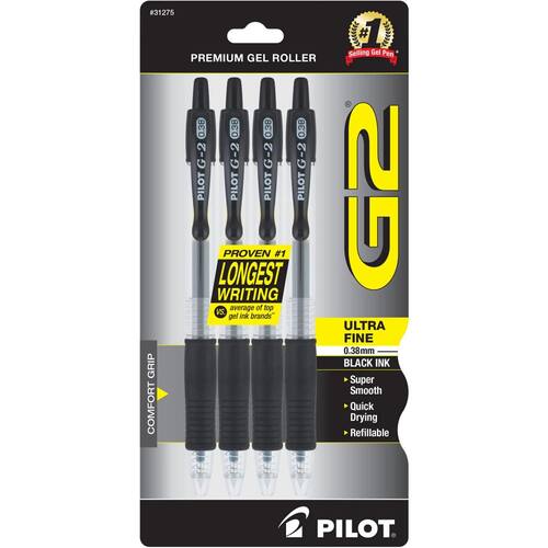 Pilot, Canetas rolo de gel premium G2, ponta ultrafina de 0,38 mm, pacote com 4, preta