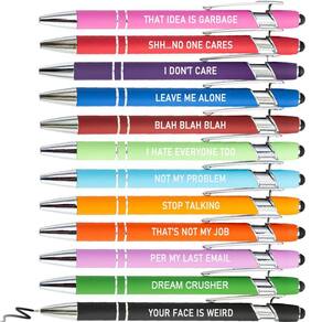 Característica adequada para guardar: as canetas desmotivacionais têm cerca de 14 x 1 cm, o que é adequado para segurar com as mãos. As canetas divertidas para adultos podem ser colocadas na bolsa ou no estojo sem ocupar muito espaço, proporcionando conveniência a qualquer hora e em qualquer lugar. Estojo de metal: com estojos de metal, as canetas divertidas para mulheres não se destr ou se deformam facilmente ao cair no chão por acidente. Segurar a caneta feminina na mão é melhor do que uma caneta de plástico, oferecendo um serviço de longo prazo e uma boa experiência de usuário. Essas canetas esferográficas escrevem suavemente em vários tipos de papel, e a tinta preta não penetra no papel, proporcionando uma experiência de escrita confortável Material: metal Cor: 12 cores diferentes, como nas fotos. O pacote inclui: 12 peças de canetas engraçadas com pontas de caneta Cor da tinta: preto Tamanho: 5,5 x 0,4 polegadas/14 x 1 cm Observações: O tamanho do produto é medido à mão. Considere um pequeno erro. Por favor, não bata em nossos produtos com objetos duros para evitar danos e deformações. Devido à influência da iluminação e da tela, a cor do produto está sujeita ao objeto real.