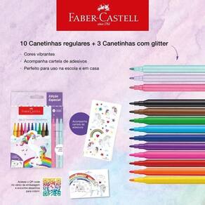 O produto consiste em um conjunto de canetinhas hidrográficas com 10 cores padrão e 3 cores com efeito glitter, totalizando 13 unidades. Cada canetinha possui corpo cilíndrico e tampa correspondente à cor da tinta. As canetinhas são acondicionadas em embalagem própria que mantém as unidades organizadas e protegidas durante transporte e armazenamento.