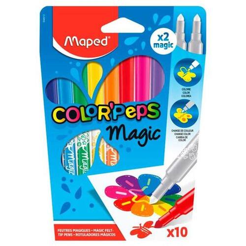 Canetinha Hidrográfica Color'Peps Magic Caixa com 10 Cores. Caneta Hidrográfica Color'Peps Mágica caixa x 12 cores. Muda de cor magicamente, primeiro passe a caneta colorida, depois a caneta reveladora que muda a cor. A tinta mudará de cor à medida que você passa a caneta reveladora. Ponta média e cônica com diâmetro de 3,6 mm e sistema de bloqueio, não afunda!