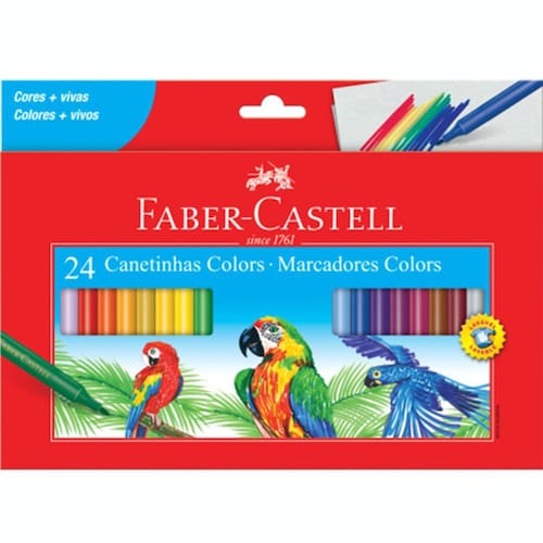 As canetinhas hidrográficas Colors da Faber-Castell estimulam a criatividade das crianças com a formulação exclusiva de corantes de alta qualidade com cores mais vivas. As canetinhas tem ponta média, a tinta é lavável e o produto é atóxico. ATENÇÃO! Não recomendável para crianças de até 3 (três) anos, por conter parte(s) pequena(s) que pode(m) ser engolida(s) ou aspirada(s). Produto atóxico e não perecível.Características:- Formulação exclusiva de corantes de alta qualidade- Cores mais vivas- Ponta média- Tinta lavável- Produto atóxico e não perecívelEspecificaçõesMarca: Faber-CastellModelo: ColorsCódigo: 15.0124CZFCores: 24 CoresProduto contém: Estojo com 24 CoresRegistro Inmetro: 003638/2012Sobre a Faber-CastellLíder mundial na produção de EcoLápis de madeira reflorestada, a história da Faber-Castell se confunde com a própria criação do lápis. Fundada em 1761 na Alemanha, hoje a empresa possui escritórios em mais de 100 países. No Brasil, onde está presente desde 1930, três fábricas (São Carlos-SP, Prata-MG e Manaus-AM) e 9.600 hectares de floresta cultivada (também em Prata-MG) são as responsáveis pela produção de 2 bilhões de EcoLápis por ano. Com mais de 70 mil postos de venda no Brasil, exporta também para mais de 70 países. Seu portfólio inclui: EcoLápis de cor e de grafite, giz de cera, tintas escolares, canetinhas hidrográficas, apontadores, borrachas, canetas, lapiseiras, kits criativos, produtos artísticos, instrumentos e acessórios de luxo para a escrita.