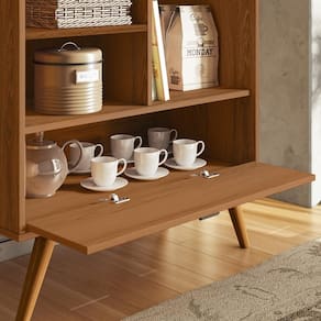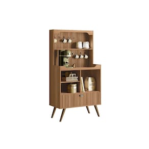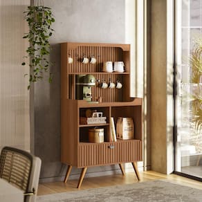 Cantinho do Café Rubi - é ideal para sua Cozinha! Com designer Retrô ele irá agregar muito mais charme e requinte ao seu ambiente. Possui o Efeito Ripado Em Tauari, com porta basculante, gancho de ferro e prateleiras para armazenamento. Amplo tampo para acomodar seus objetos de decoração, xícaras etc. Elaborado em MDF usinado com pés em madeira maciça, esses atributos garantem ao produto maior resistência e durabilidade.