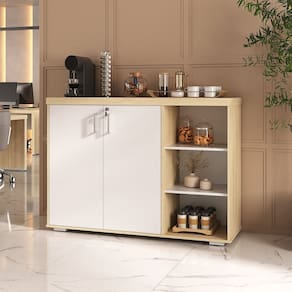 O tampo amplo acomoda cafeteira, cápsulas e utensílios com praticidade, enquanto o armário com portas mantém tudo organizado e discreto. Os nichos laterais abertos valorizam a decoração e facilitam o acesso a copos, xícaras e itens de uso diário.