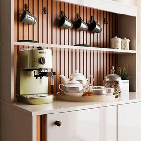 O Cantinho do Café Dolce é perfeito para transformar sua cozinha ou sala de estar em um ambiente sofisticado e aconchegante. Seu design retrô, combinado com o efeito ripado em freijó, traz um toque de elegância ao espaço. Com 2 portas, gancho de ferro e prateleiras amplas, ele oferece praticidade e organização para armazenar seus utensílios, xícaras e objetos de decoração. Produzido em MDF usinado, com pés em madeira maciça, proporciona resistência e durabilidade, garantindo um móvel funcional e charmoso.