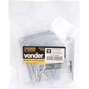 Cantoneira Para Cortina 06x08cm Zincado Cce0068 Com 4 Pç Vonder Conteúdo da embalagem 1 Pacote com 4 cantoneiras e 20 parafusos Aplicações e dicas de uso Indicada para suportes de trilho para cortina Destaques e diferenciais Prática e fácil de instalar. Acompanha parafusos para fixação. DETALHES TÉCNICOS
