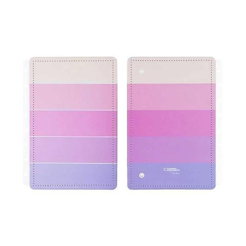 São 3 tamanhos disponíveis: A5, Médio e Grande - Capa e contracapa rígidas, acompanha 01 folha de instrução de uso e manuseio, com refis e acessórios da marca disponíveis no verso e 01 folha de identificação com calendário no verso,