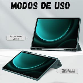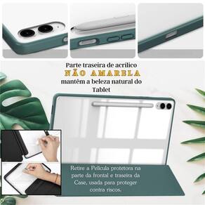 A capa é projetada com um slot para caneta, permitindo fácil acesso e armazenamento da sua caneta. Além disso, a textura de silicone na parte externa da capa proporciona uma aderência confortável e segura, evitando que o tablet escorregue enquanto você o segura. A parte traseira de acrílico também não amarela com o tempo, mantendo a aparência elegante do seu dispositivo por mais tempo.