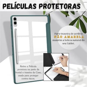 A capa é projetada com um slot para caneta, permitindo fácil acesso e armazenamento da sua caneta. Além disso, a textura de silicone na parte externa da capa proporciona uma aderência confortável e segura, evitando que o tablet escorregue enquanto você o segura. A parte traseira de acrílico também não amarela com o tempo, mantendo a aparência elegante do seu dispositivo por mais tempo.