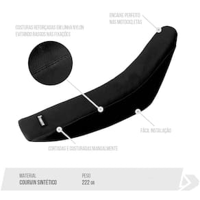 É fabricado em courvin sintético especial, que proporciona resistência, durabilidade e grip acima da média para o banco de sua moto.