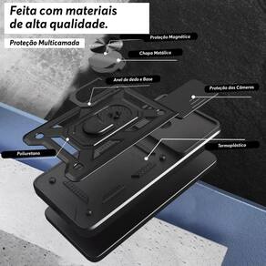 Alta proteção com alto relevo na câmera, dupla resistência anti impacto, anel de dedo com metal para aderir em imã, anel ajustável para função de base, slide cover para proteção das câmeras e privacidade. Não suporta carregamento por indução.Características