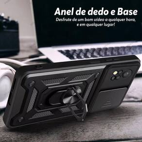Alta proteção com alto relevo na parte que protege a câmera; dupla resistência com proteção anti impacto de dupla camada; anel de dedo e metal imbutido para aderir em imã; anel ajustável para função de base; encaixe perfeito; slide cover para maior proteção das câmeras e maior privacidade.Tipo