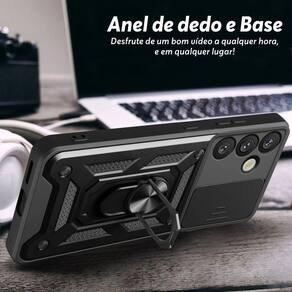 Capa protetora resistente anti impacto com armadura militar. Possui alta proteção com alto relevo na parte que protege a câmera, dupla resistência com proteção anti impacto de dupla camada. Inclui anel de dedo e metal imbutido para aderir em imã, com função de base ajustável. Encaixe 100% perfeito. Possui slide cover para maior proteção das câmeras e privacidade. Todas as funções e botões funcionam normalmente, exceto o carregamento por indução.Tipo