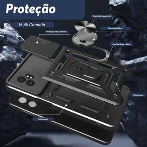 Capa protetora militar anti impacto, com suporte metálico giratório 360º e tampa deslizante para lente.Características